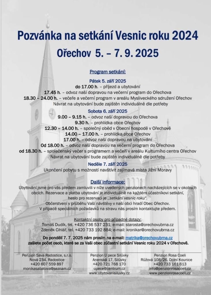 Obec Ořechov nás srdečně zve na setkání Vesnic roku 2024, které se koná od 5. do 7. září 2025. Program zahrnuje příjezd a večerní program, prohlídku obce a společenský večer. Zájemci se prosím ozvěte do 6. července 2025 starostce obce buď telefonucky nebo emailem. Dle počtu účastníků budeme řešit možnosti dopravy.