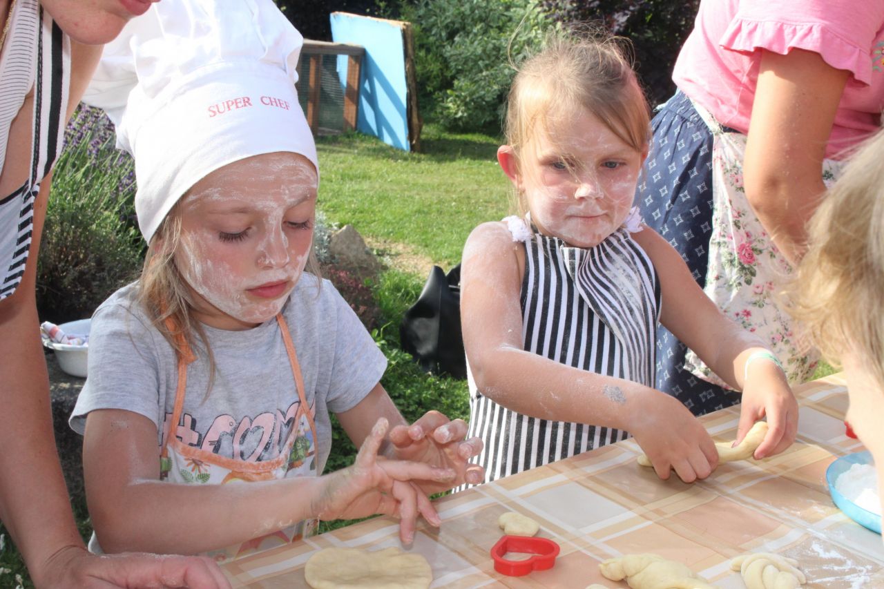 Odpoledne 20.července se sešla parta malých kuchtíků a společně s rodiči,  tetou Petrou a Irenkou jsme tvořily nejen kobližky, ale i různé tvary z kynutého a tvarohového těsta. Děti se podílely na přípravě těsta, dalším zpracování, až po konečné společné pomlaskání. Fantazie byla opět plně využita a některé tvary byly malá umělecká díla.